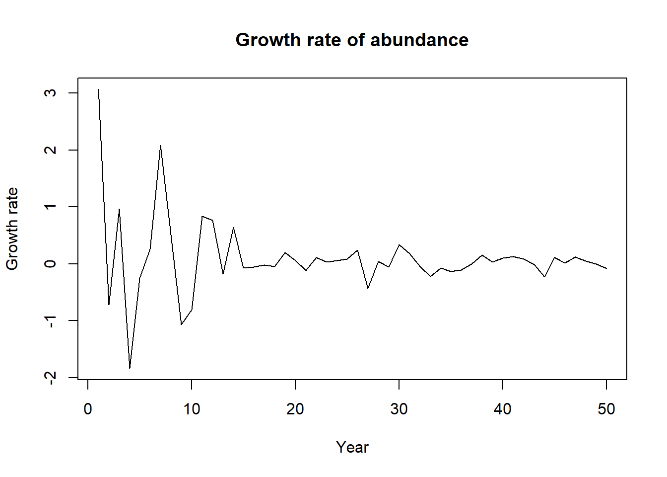 plot(t,growthrate,type="l",xlab="Year",ylab="Growth rate",main="Growth rate of abundance")